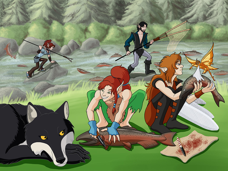 2016 RTH Calendar: April Karena Kliefoth Artist note: Working on a salmon run: Evervale (with Halfmoon) and Willow with Gurgleflap (foreground), Crackle and Raven (background).