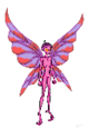 Flutterby:eyes are extremely dark purple (nearly black); skin is light spring green; wings are light pink fading to a light purple color with dark pink veins. Flutterby was a special friend of Whispersilk, being the main producer of the wrapstuff that used in the creation of Whispersilk's woven silk. Tends to wear head-coverings consisting of scraps of the silk that Whispersilk (and other weavers) make, in different colors and styles as whim takes it. During Whispersilk's lifetime, Flutterby felt that it was Whispersilk's sole protector, never leaving her side for very long, and was a particular nuisence to Windburn because of it. Flutterby likes to think of new and interesting ways to make funny noises come out of Windburn.