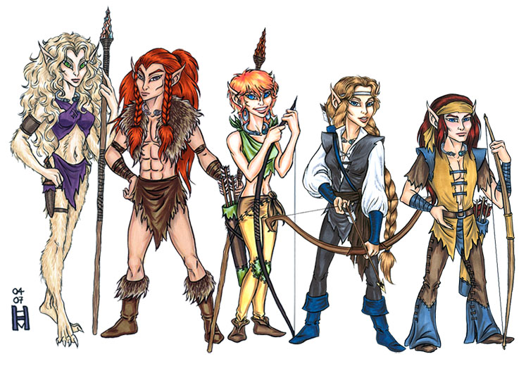 Halfwolf was one of those who looked like an even mixture of wolf and elf – but he was elvish enough to Recognize with some of the High Ones. His first offspring was Wolfsister. Halfwolf and several of his full and half siblings Recognized with a number of the High Ones, producing wolf-blooded, mortal offspring whose looks varied from a feral mixture of wolf and elf, to some who were all-but indistinguishable from the High Ones (except for their mortality, keener senses, and later tendency amongst the males to grow facefur). These included Eagle-Eye, Knifemaker, Crow, Moth, Cubmaker, Raincaller, Bravestride, and Greenleaf.