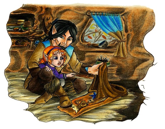 “What do you see?” Farscout asked. “Starfish,” Copper replied, naming each item. “Bug-stone. Running wolf. Woodmouse head. Purple earring. And a rattlesnake tail.” “Good.” Farscout covered the items with a fold of the sleeping fur. “What do you want to sing?” “Butterfly song!” The lullaby was Copper's current favorite, and they'd already sung it dozens of times that afternoon, but Farscout joined in with the same enthusiasm as he had had for the first. Butterfly, butterfly, open your wings Fly through the woods and fly over the streams Butterfly, butterfly, fly through my dreams While everyone dances and everyone sings “Now,” Farscout said, instead of starting the lullaby's chorus. “What's on the blanket?” Copper frowned thoughtfully. “Running wolf. Rattlesnake tail and a mouse skull. Mother's earring. Blue starfish.” Farscout pulled aside the fold of the blanket, exposing those items again to view. “Good!” he said. “Well done!” “The Butterfly song again!” Copper asked. “Butterfly, butterfly, open your wings. Fly through the woods and fly over the streams...” they sang, while Farscout set aside the mouse skull and pulled a replacement item from a small pouch. It was a a shallow clay candle dish, with tiny painted salmon leaping around its rim. He put it down on the blanket, then moved the rest of the remaining items around into new locations. “What do you see on the blanket?” he asked, after they'd finished the second chorus of the song. “Yellow bug-stone,” Copper replied, naming each item. “Toy wolf. Mother's curly earring. A snake rattle and a fish-dish.” “Good.” Farscout let his daughter look at the items for a moment longer, then covered them again with a fold of the blanket. “What do you want to sing now?” “The butterfly song!” Farscout laughed a soft, nearly soundless laugh, but joined in again readily enough: Butterfly, butterfly, open your wings Fly through the woods and fly over the streams Butterfly, butterfly, fly through my dreams While everyone dances and everyone sings Butterflies red and butterflies blue Butterflies old and butterflies new Taste the silvery morning dew Taste the rosemary and the feverfew All the pretty flowers growing in the spring All the autumn mushrooms growing in a ring Butterfly, butterfly, fly high in my dreams While everyone dances and everyone sings “Now,” Farscout said, as they finished another round of the lullaby. “What do you remember being on the blanket?” Copper opened her mouth to speak, but then hesitated as if she couldn't remember. She frowned thoughtfully, then spoke up in a hesitant voice. “A little turtle shell. A dried yellow leaf. A big broken tooth. Candlefish on a string. A smooth stone and an arrow. And the green-and-purple knife.” Farscout sat silent, one hand pressed down against the blanket. His daughter's random recitation meant nothing to him for a heartbeat, but then -- ... he was a small child again, sitting in Lynx's lap as they played the memory-game. “What do you remember?” Lynx was asking him. “What did you see on the blanket?” The items had been arrayed in two irregular lines – the shell from a baby box turtle, a dried capnut leaf and a jagged bear tooth on the top, and below them a string of four candlefish, a stone smoothed by the river, and a knapped bone arrowhead. Briar had recited those items from memory, confident of his recollection and proud to please Lynx by doing so. “Good! Very good!” Lynx had said, reaching for the fold of the hide. “But I think you forgot something...” The boy had felt a moment of keenest dismay – he had fixed each item in his memory, he was sure of it, so what had he forgotten? Then Lynx turned back the fold of the hide, exposing the items to view again. And there in the center, between the two rows of objects, there was now a small knapped knife. It was of polished green glass-stone threaded with vibrant streaks of purple, with a carved antler hilt far too small for Lynx's big hands. “Tsk, tsk, I can't believe you could have forgotten this, not after I made it for you myself...” Lynx said, the teasing tone of his voice hinting that he had, through some sleight of hand, just slipped it between the folds of the hide. “Pick it up – how does it fit your grip?” Farscout sat silent, that memory as fresh in his mind for a moment as though it had happened yesterday. In his lap, he felt Copper twist around in order to look up at him. Her expression was distraught, as though her words disturbed her as much as they had her father. “How do you remember that?” Farscout asked oh-so-very-quietly. His daughter stared at him, her violet eyes troubled. “I don't know,” she whispered. “I just do.” “Do you want to talk about it? About what you remember?” Copper shook her head adamantly. Farscout slowly let go of his breath, then stroked his daughter's red-gold hair. It wasn't the first such moment he had experienced with his child. He didn't understand how or why she seemed to know such odd things. He and Brightwood had puzzled over it in private, and had agreed that just maybe Copper had absorbed things from her long rapport with Brightwood during their centuries in wrapstuff. But Lynx's gift of the greenstone knife? It was a treasured moment from Farscout's early childhood... from before Brightwood's birth. And it wasn’t a memory he thought he had ever had reason to share with his lifemate. Farscout pushed aside the sleeping fur, its items still buried from view. He hugged his daughter close and smiled for her. “Let's get our coats and walk down to the wolf dens to see Flea, shall we?” he asked. Copper smiled with relief and scrambled to her feet. Farscout helped her get her winter coat down from its peg and was bundling her into it when Copper met his eyes again. “It was a very pretty knife,” she said. “Wasn't it?” Farscout tousled his daughter's hair, and fo